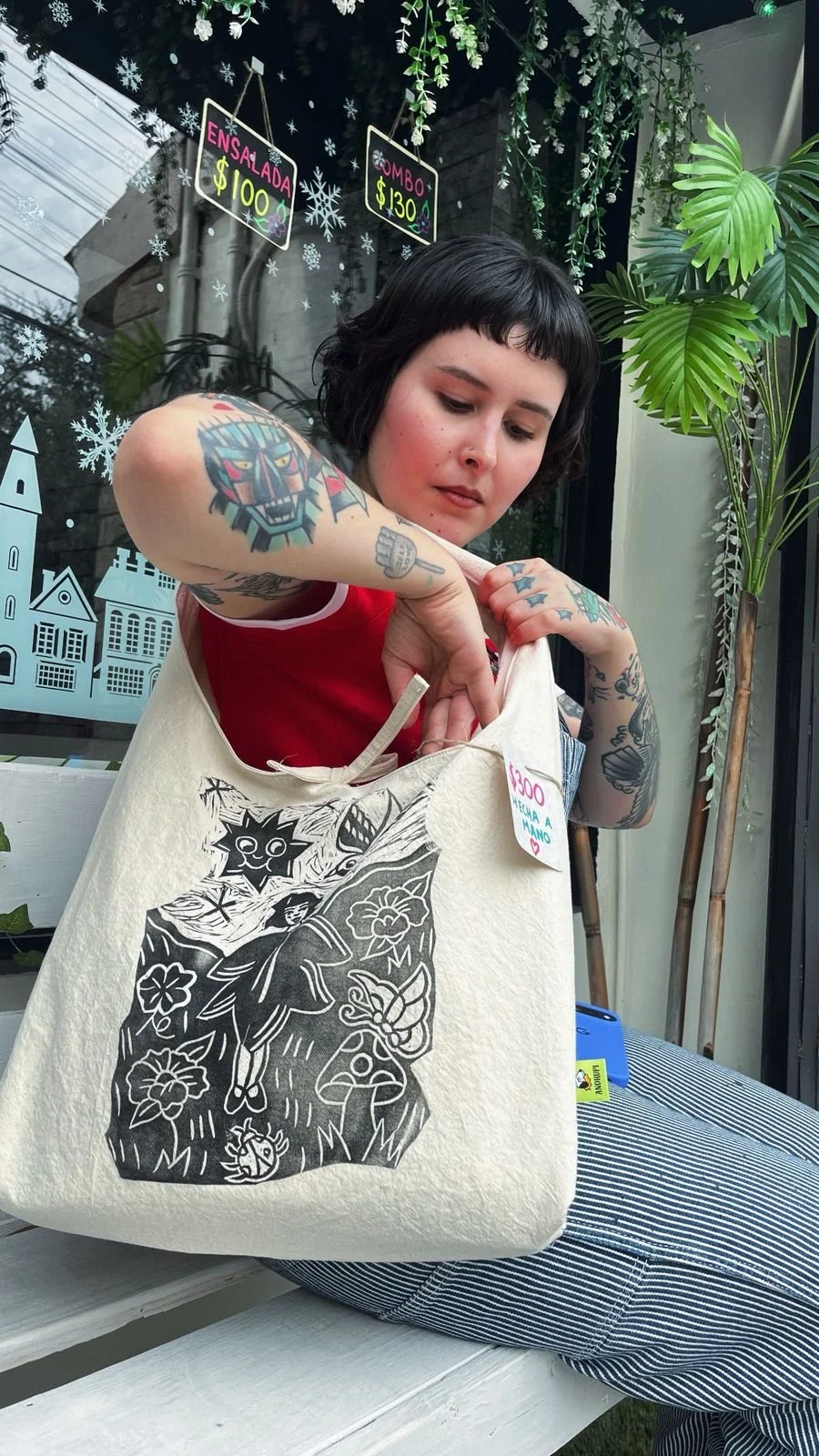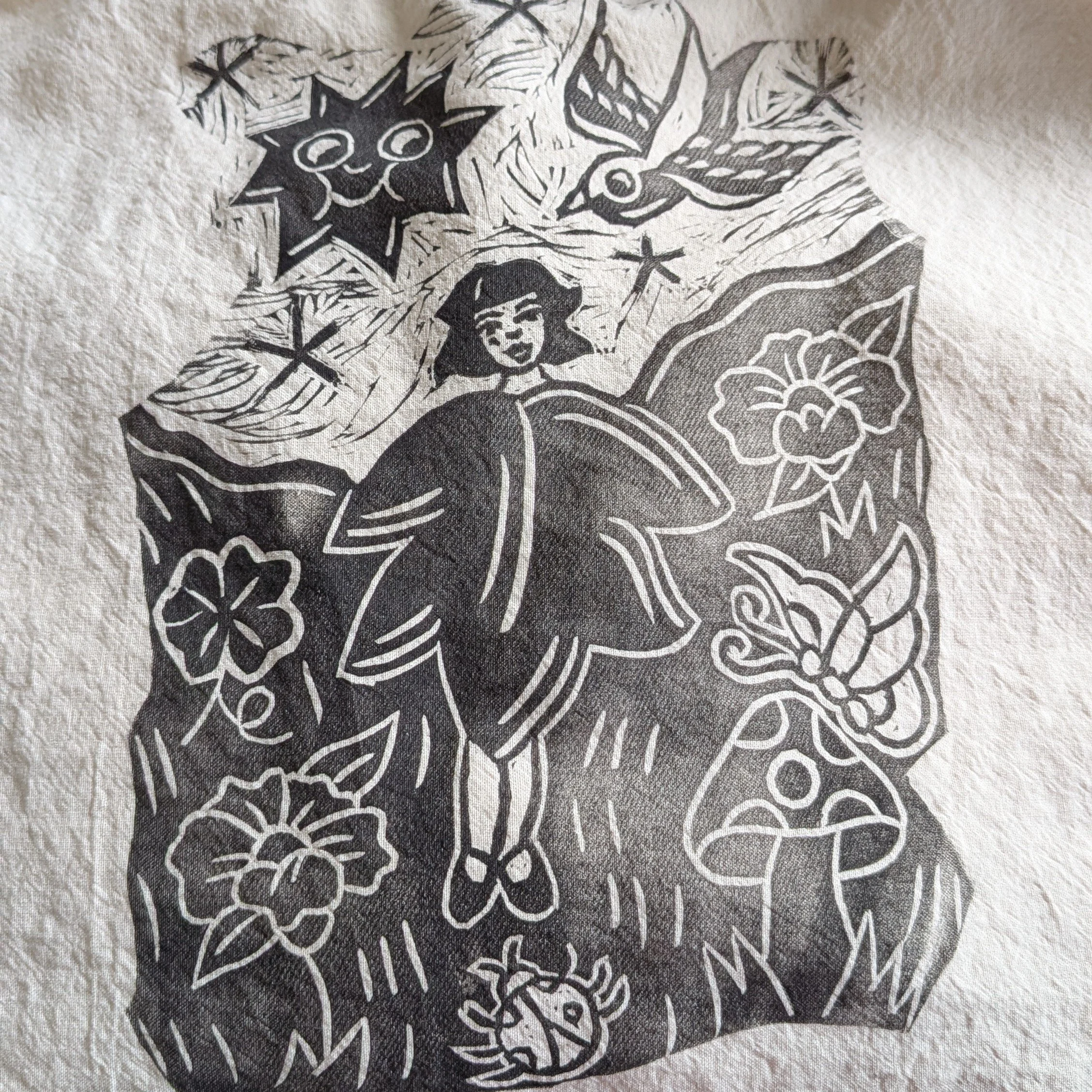 Ilustración original en linograbado sobre tela 💖 Un diseño inspirado en la magia de la naturaleza y la libertad. Cosida a mano para quienes buscan llevar una pieza de arte auténtica en su día a díaaa